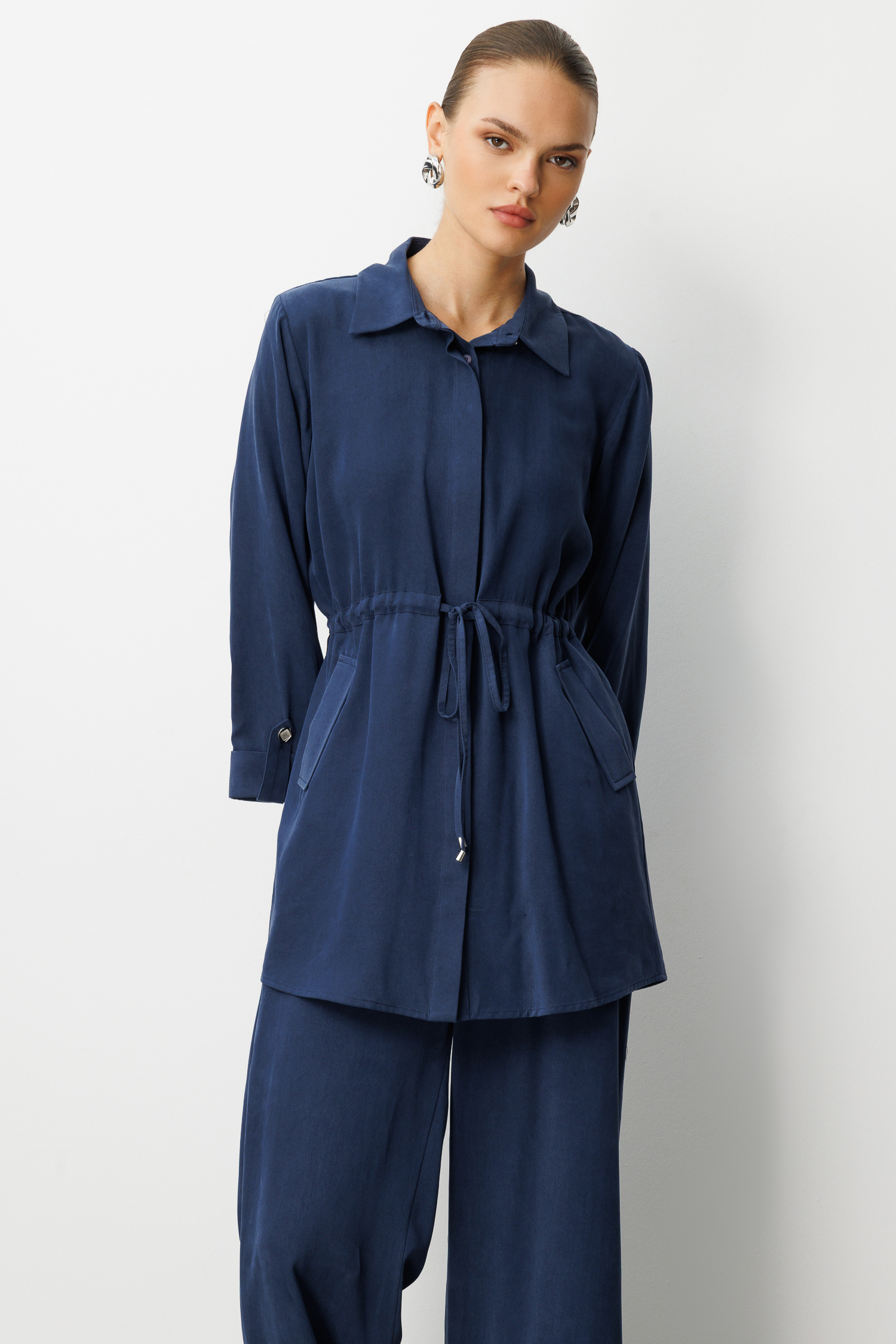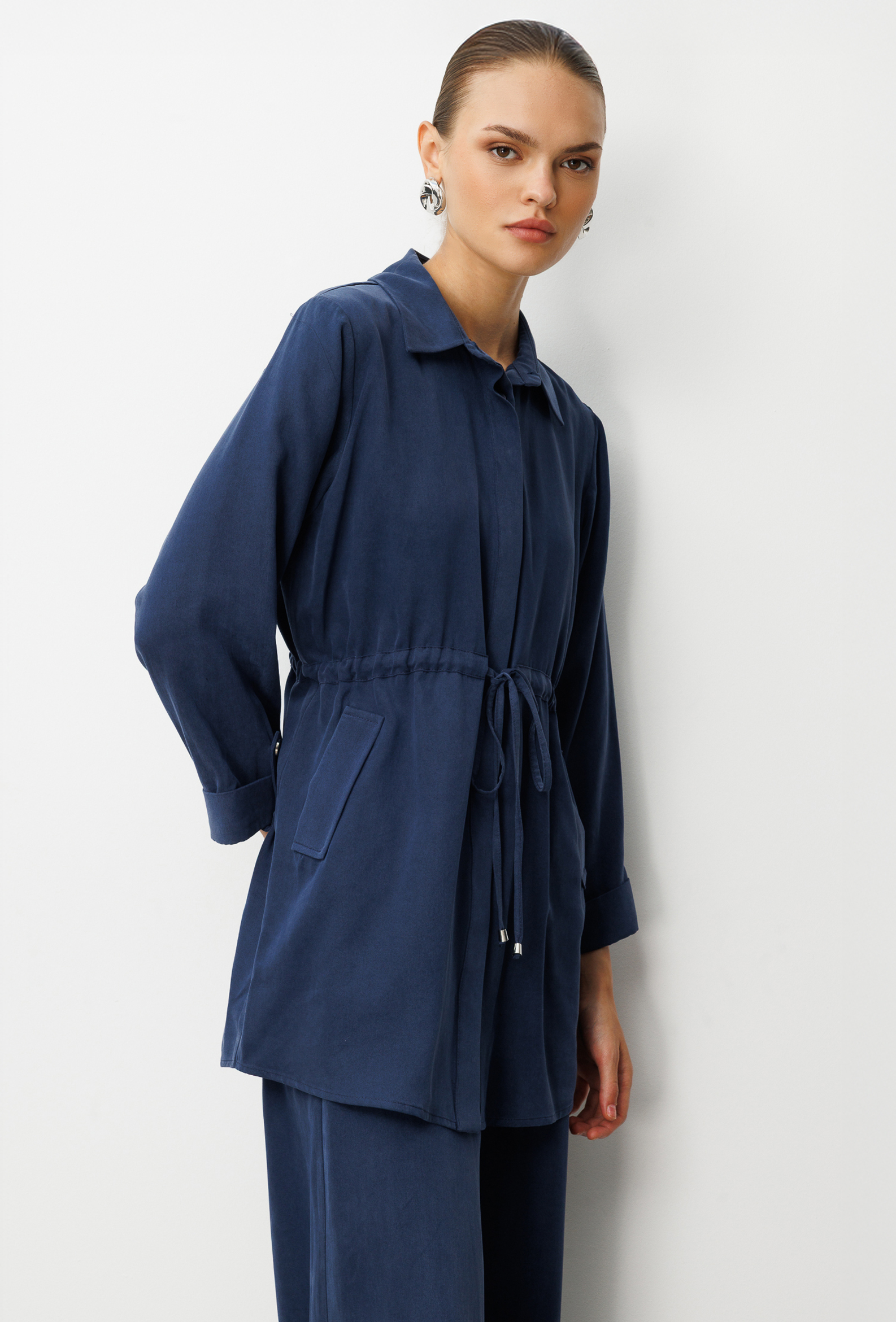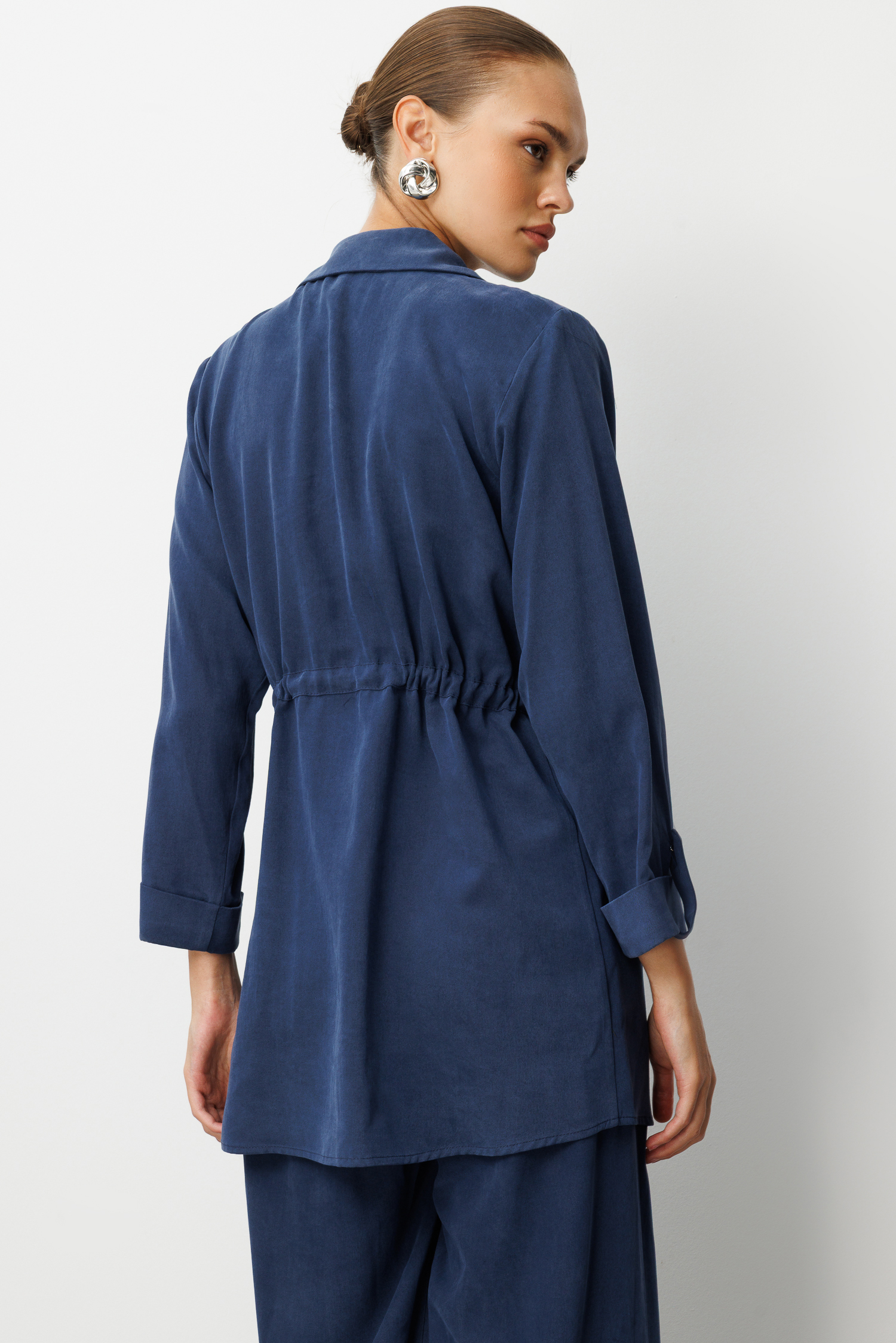 Mizalle Beli Büzgülü İndigo Mavi Cupro Tunik, modern tasarımı ve kaliteli kumaş dokusuyla öne çıkan özel bir parçadır. Şık detayları sayesinde hem günlük yaşamda hem de özel davetlerde rahatlıkla tercih edilebilir. regular fit kalıbı ve uzun kol tasarımıyla konfor ve şıklığı bir araya getirir.