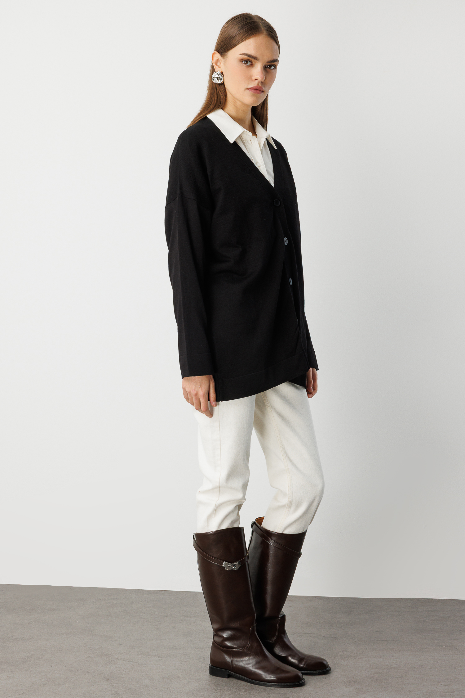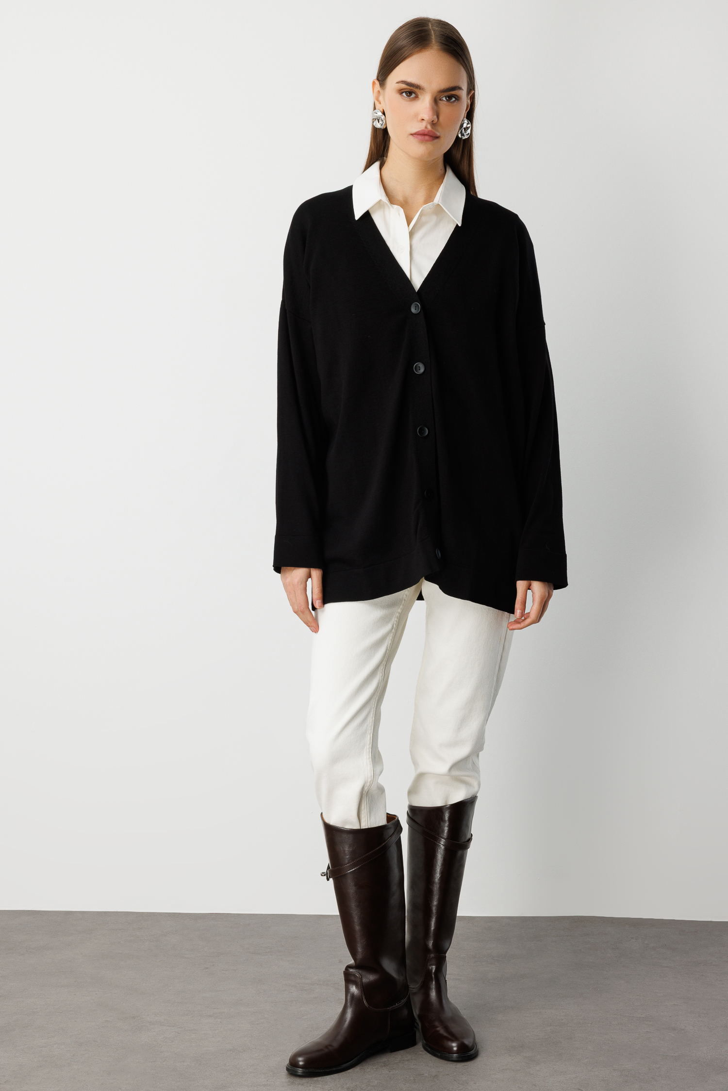 Mizalle Ekstra Oversize Düşük Kol Basic Siyah İnce Triko Hırka
