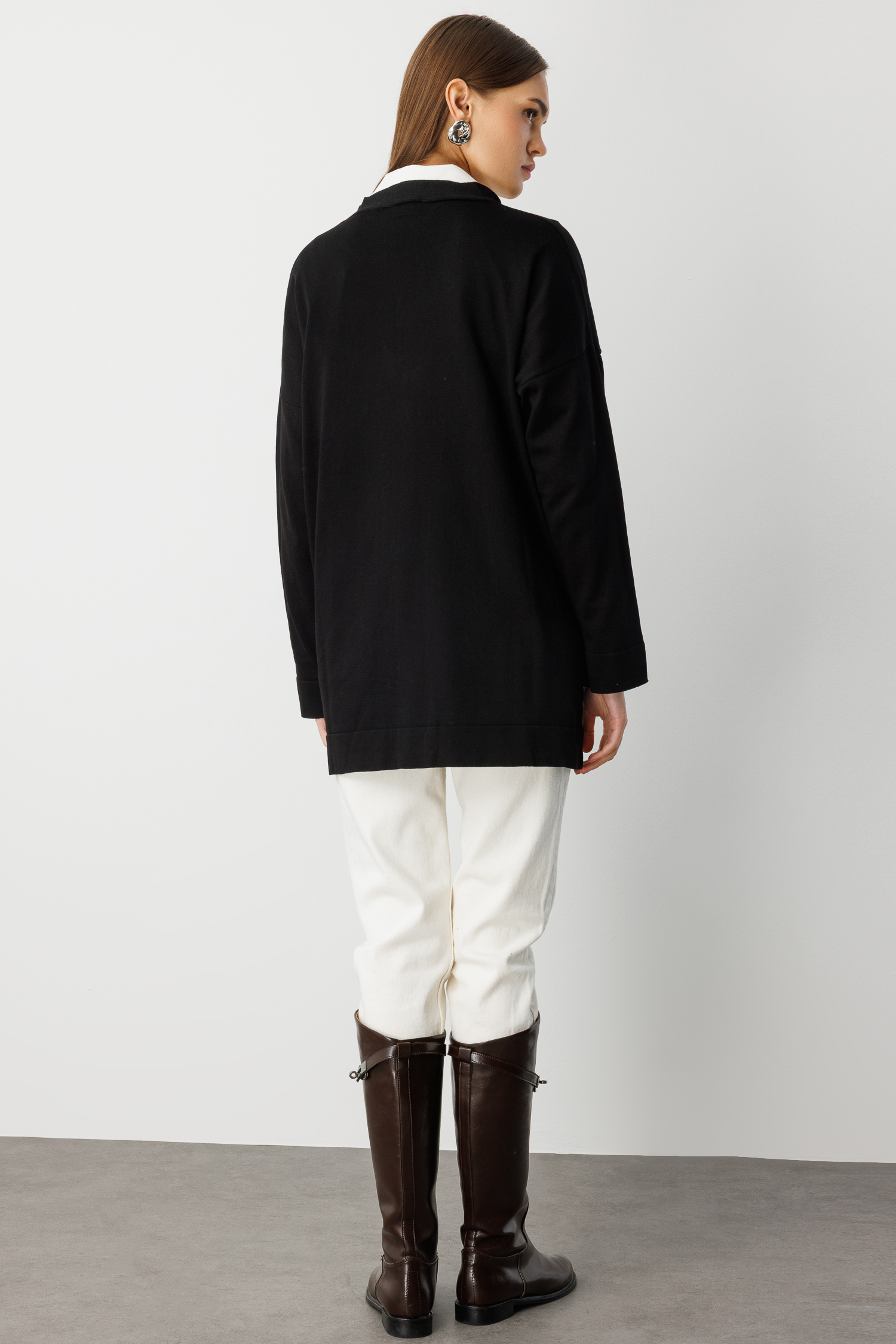 Tek Beden olarak tasarlanmıştır; esnek triko yapısı sayesinde 36'dan 42'ye kadar tüm bedenlerde dökümlü ve konforlu bir uyum sunar. Yumuşak, ince triko dokusu, Düşük Kol ve Ekstra Oversize kesimiyle ürüne modern, rahat bir silüet katar. Basic siyah rengi ve sade formu sayesinde pantolonlardan elbiselere kadar tüm kombinlerinizde katmanlama (layering) için idealdir.