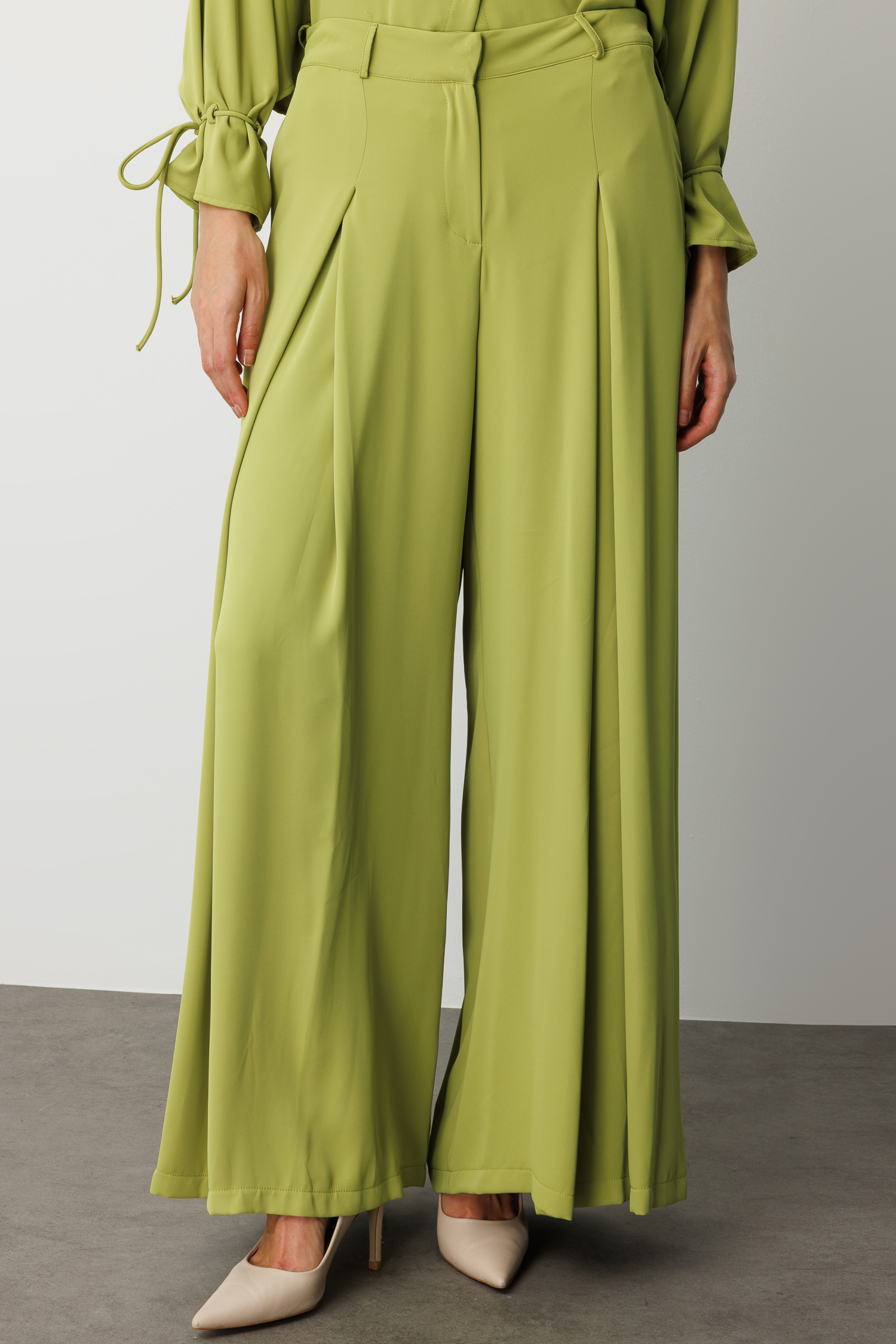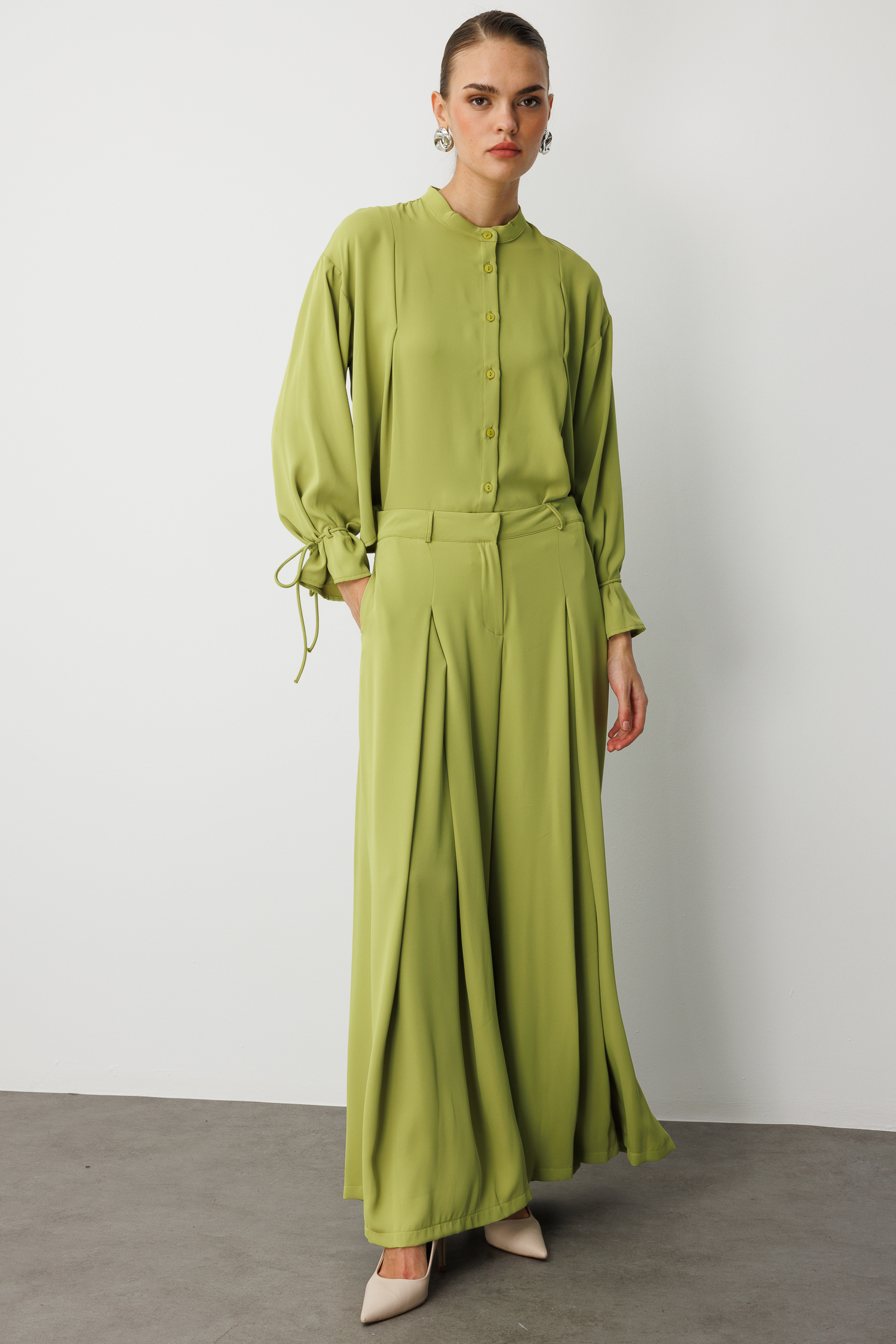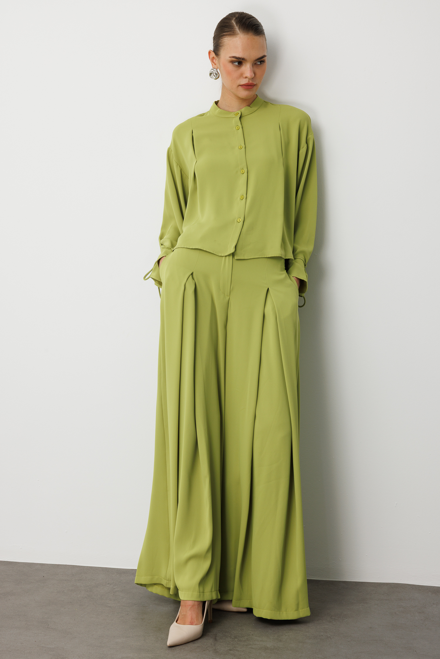 Mizalle Geniş Pileli Bol Kesim Şifon Yeşil Pantolon, hafif dokulu şifon kumaşı ve akışkan siluetiyle zarafeti konforla buluşturan modern bir tasarım sunar. Bel kısmındaki geniş pile detayları hareketli ve sofistike bir duruş yaratırken, bol kesim formu pantolona hem dökümlü bir görünüm hem de gün boyu rahatlık kazandırır. Sezonun doğal ve canlı yeşil tonuyla öne çıkan bu parça, özel davetlerden günlük şıklığa kadar geniş bir kullanım alanı sunan, stil sahibi görünümler için ideal bir tamamlayıcıdır.