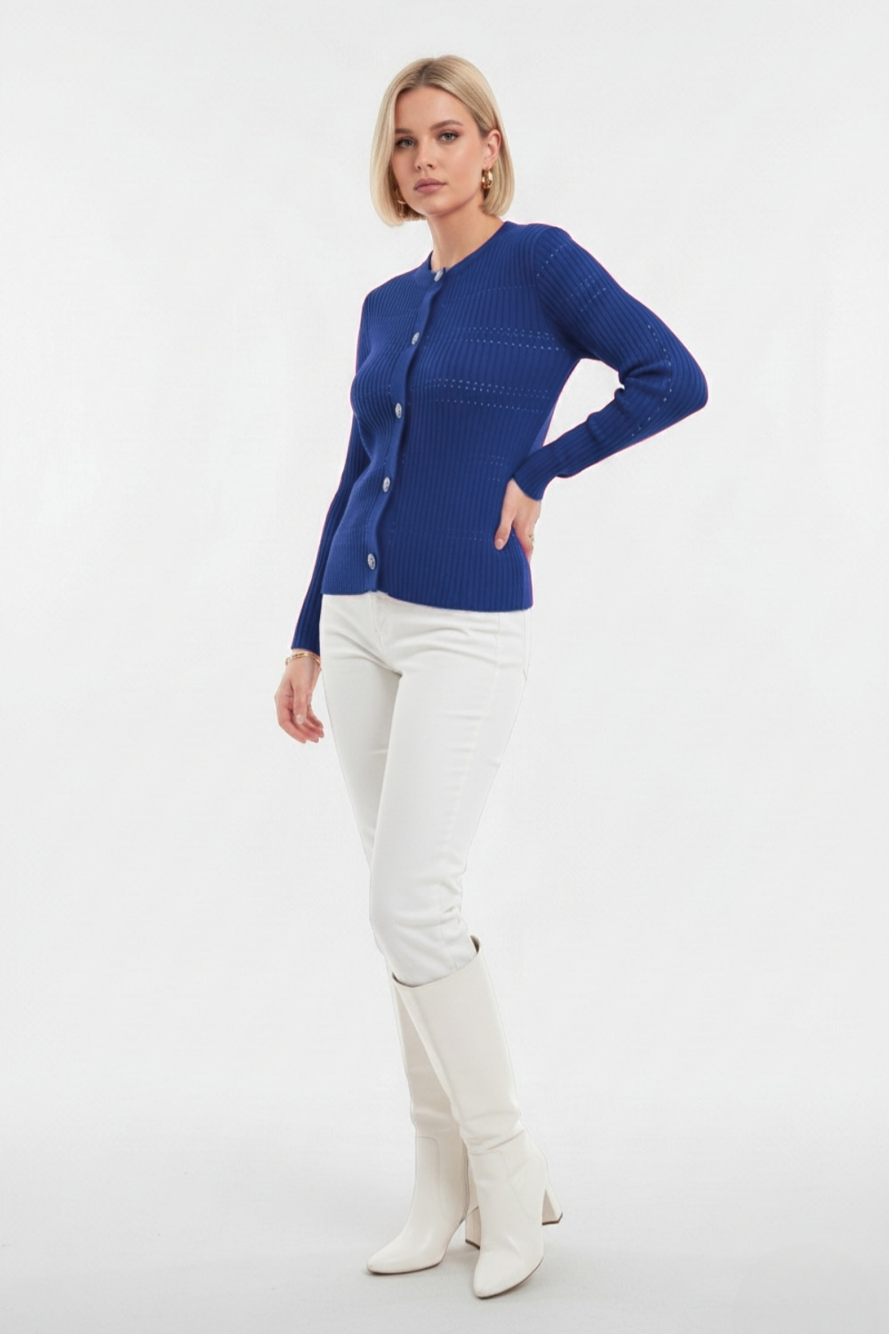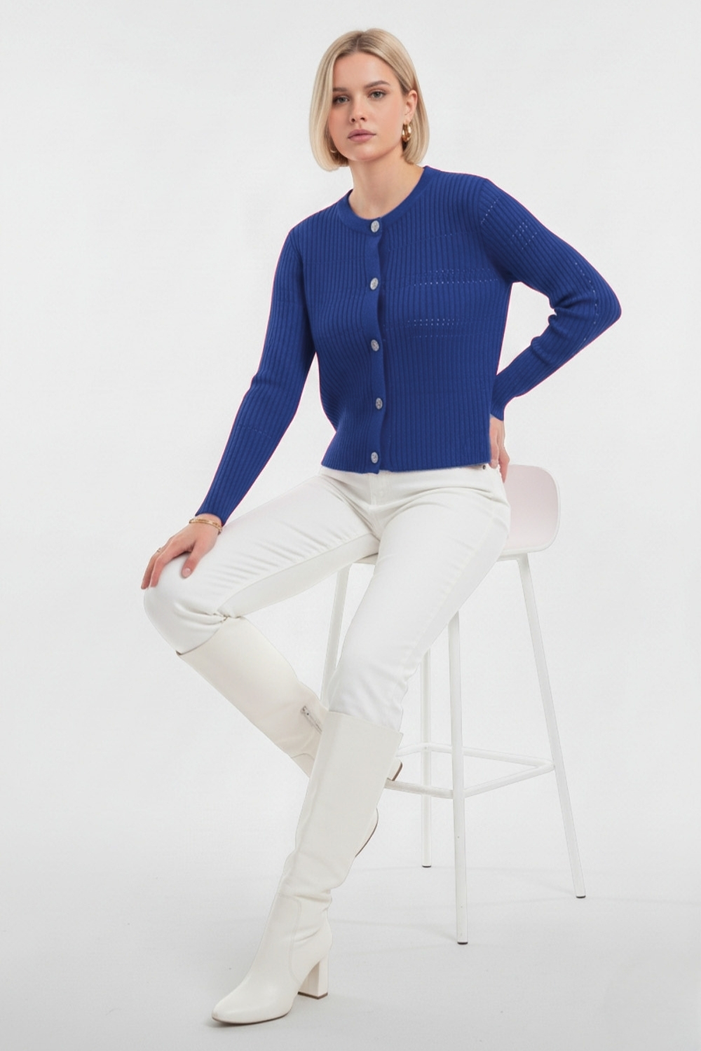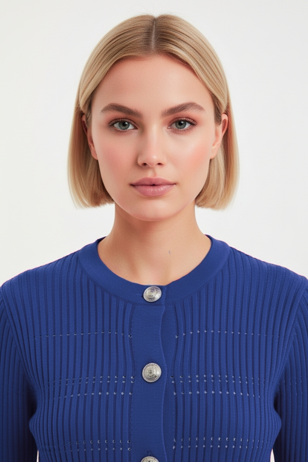 Mizalle Metal Düğmeli Yuvarlak Yaka Kaşkorse Saks mavi Hırka