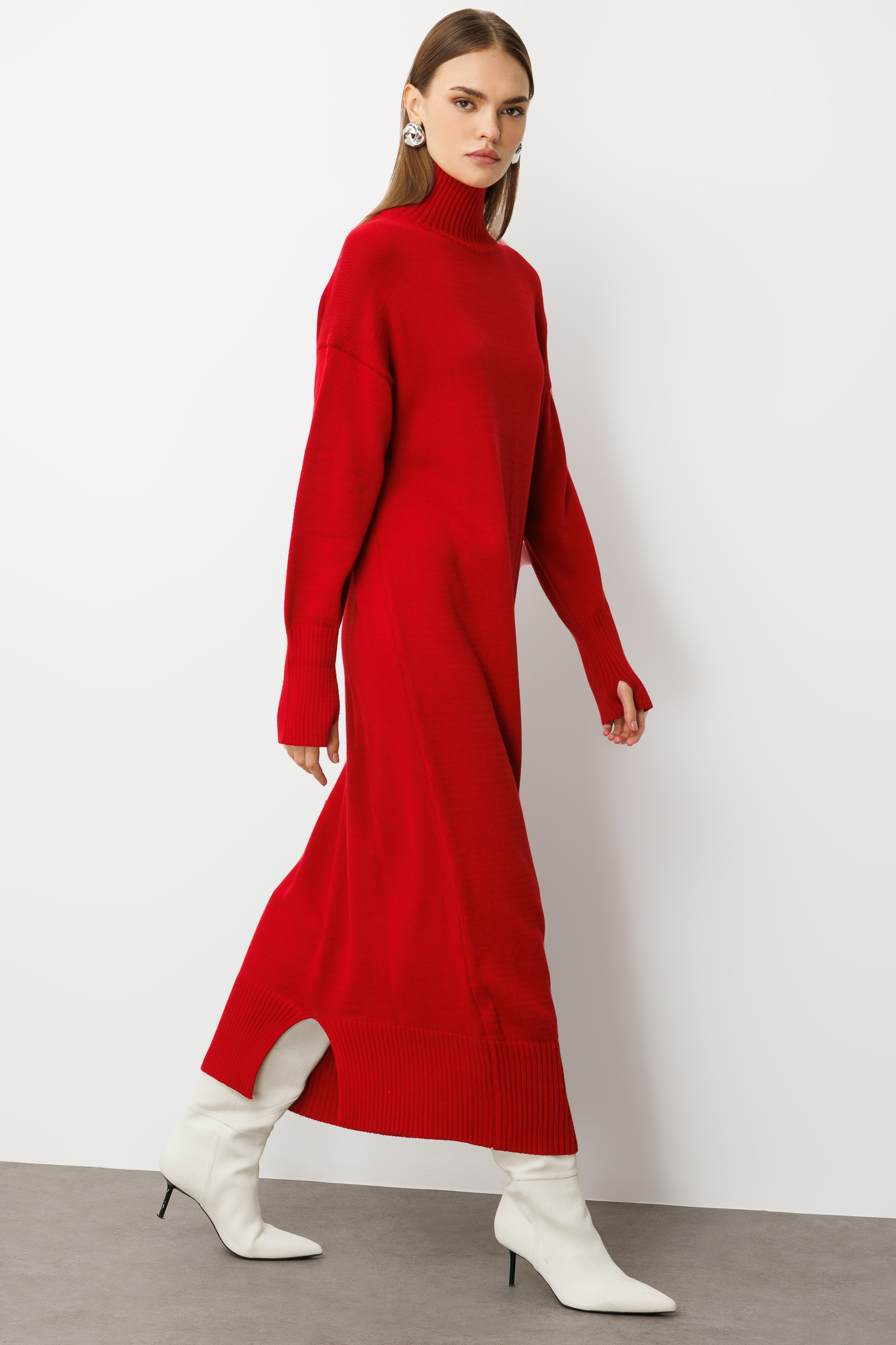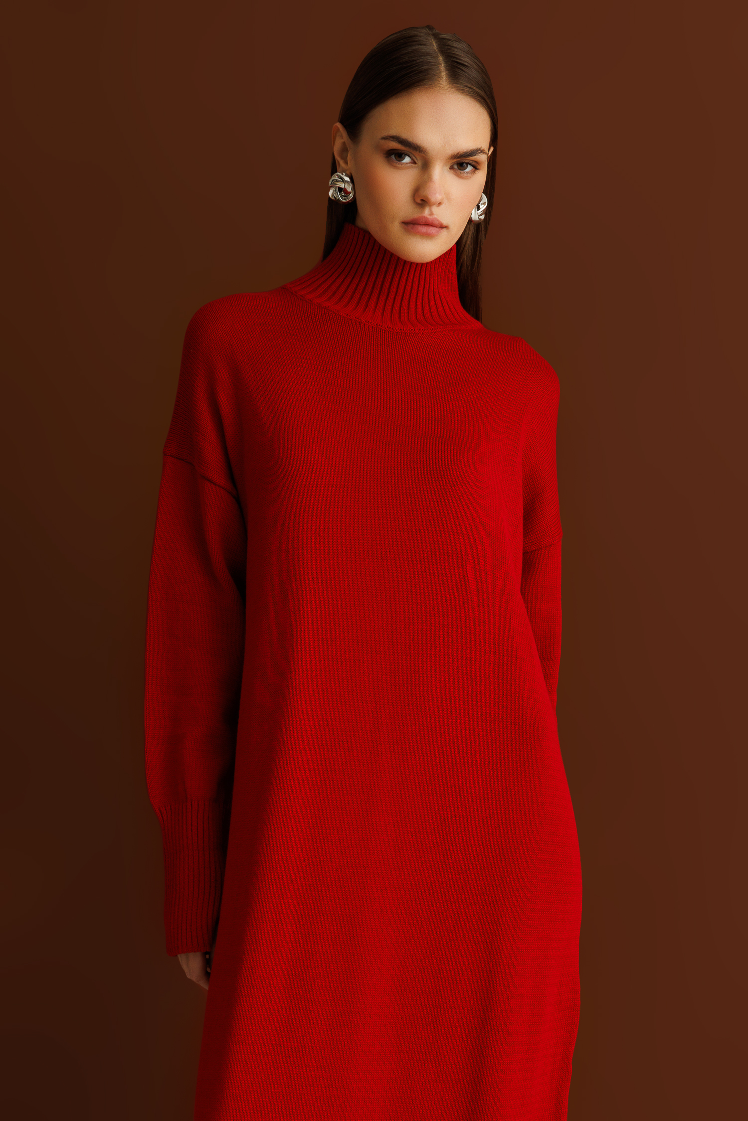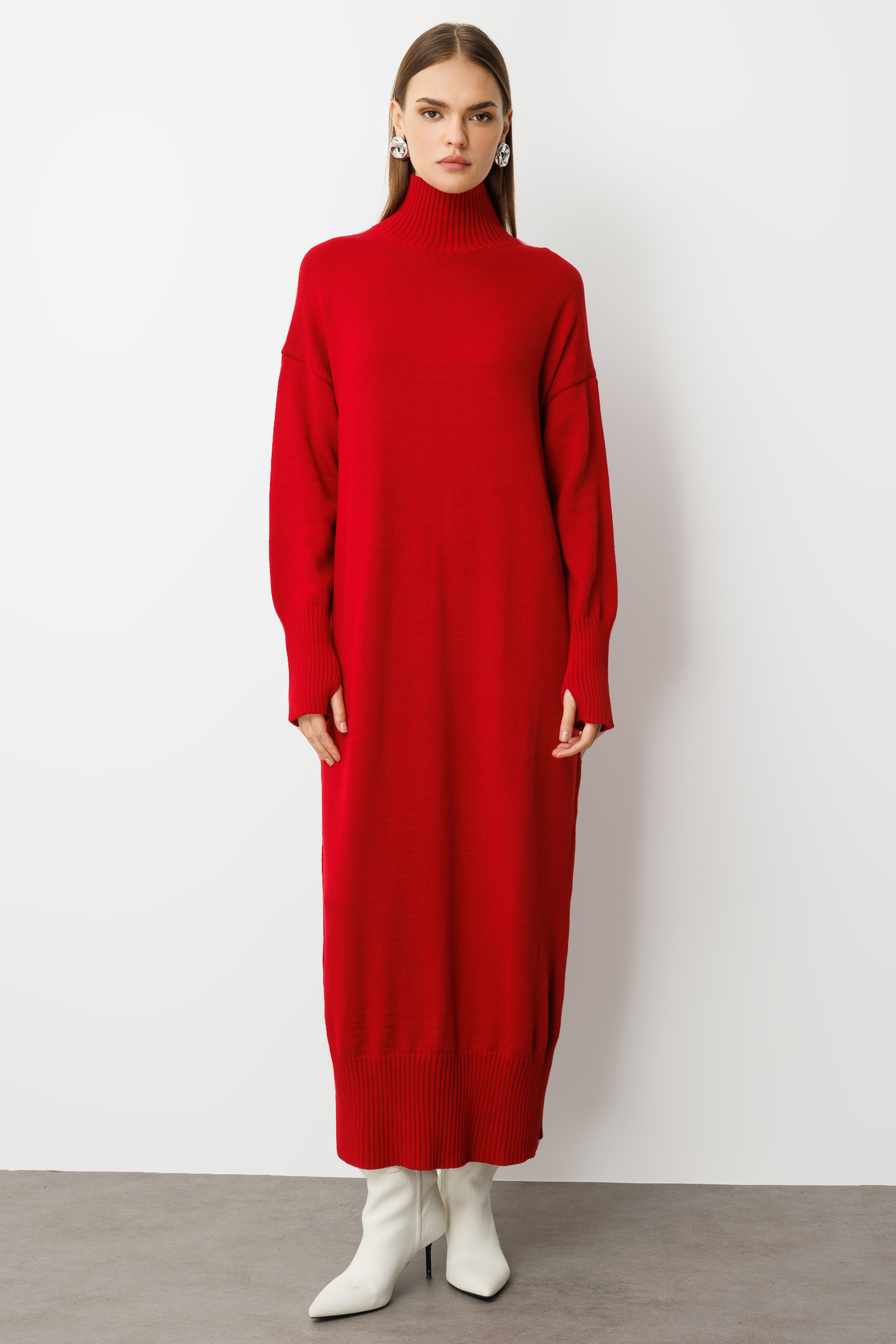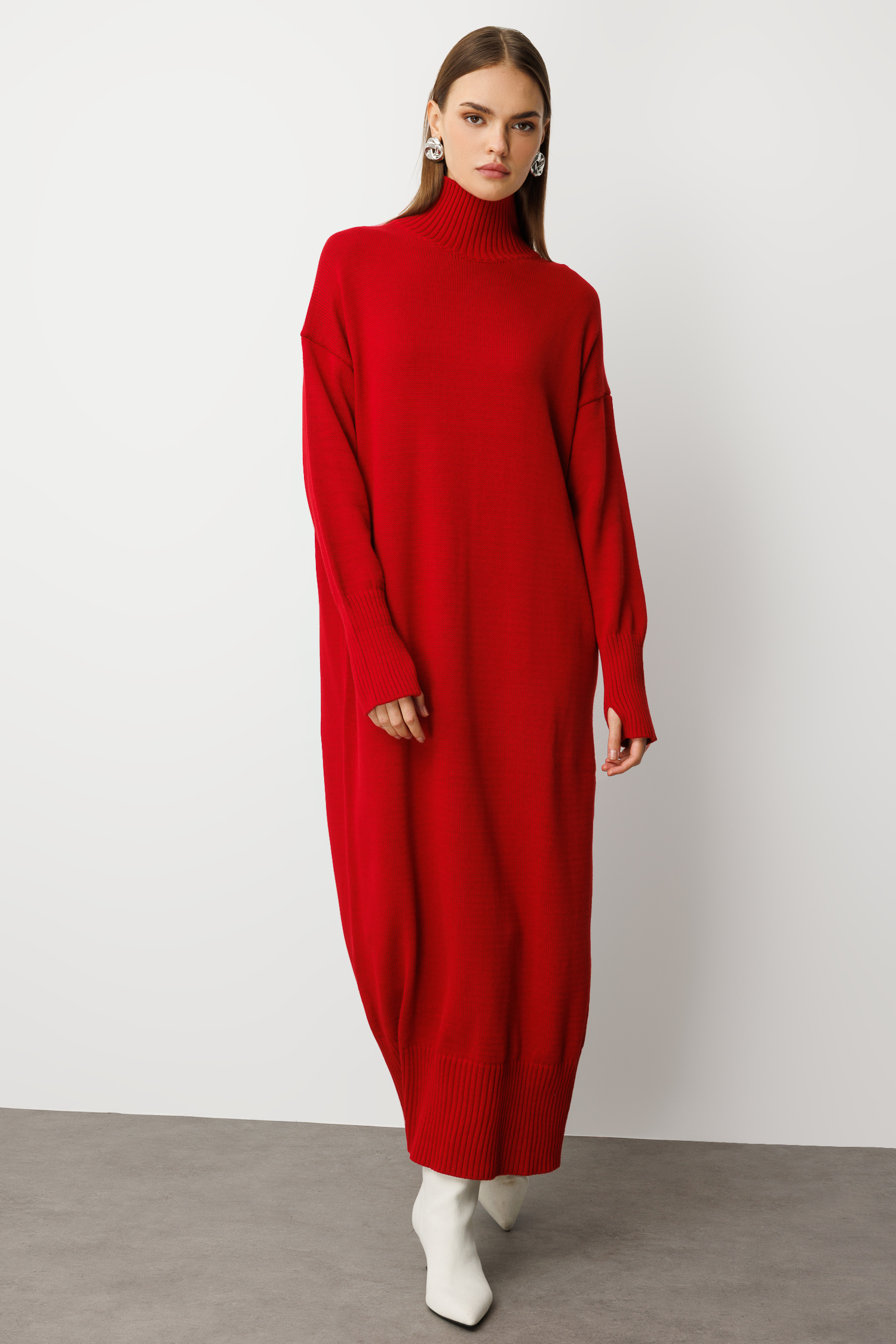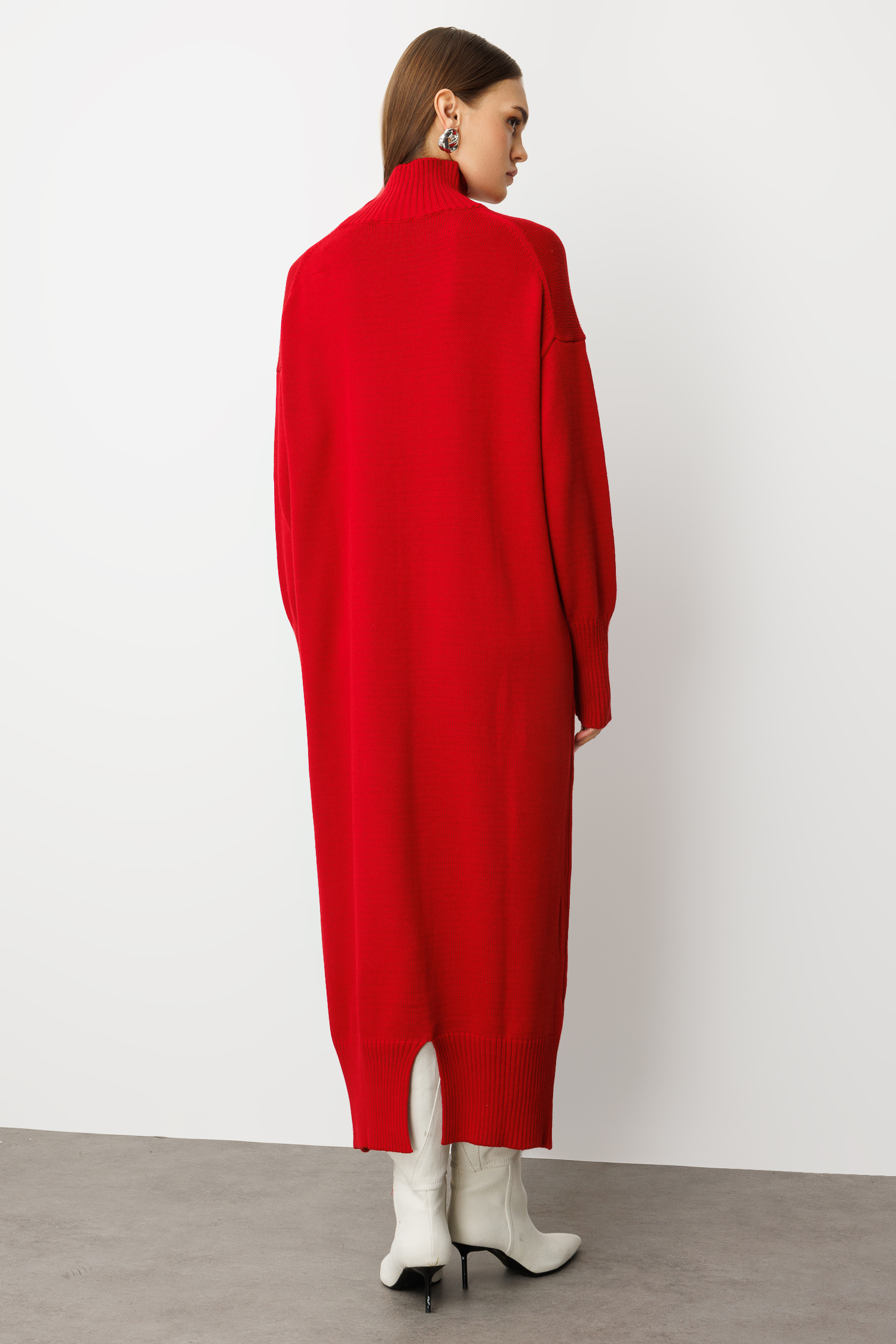 Mizalle Oversize Dik Yaka Kırmızı Uzun Kalın Triko Elbise