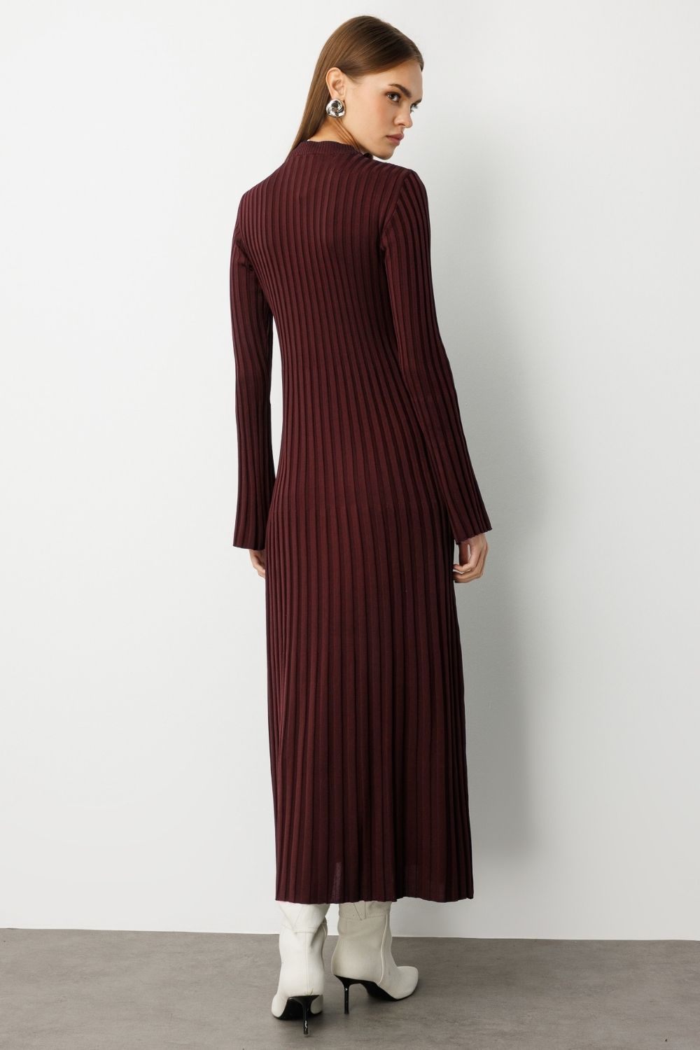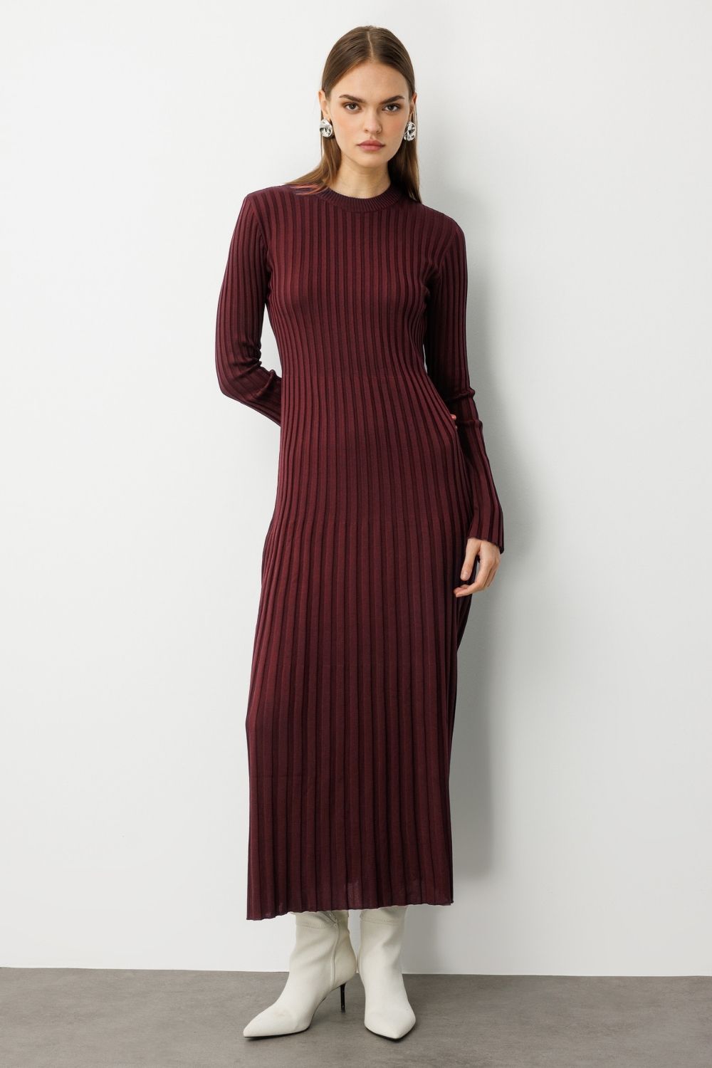 Mizalle Volanlı Etekli Yuvarlak Yaka Bordo Kaşkorse Uzun Triko Elbise