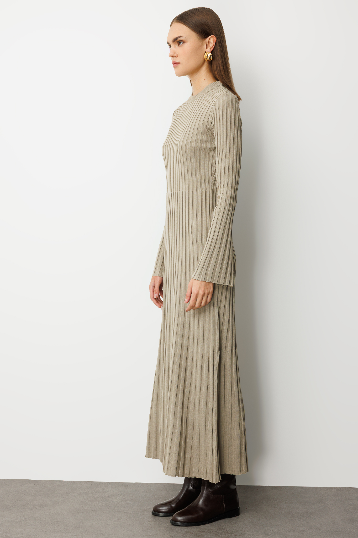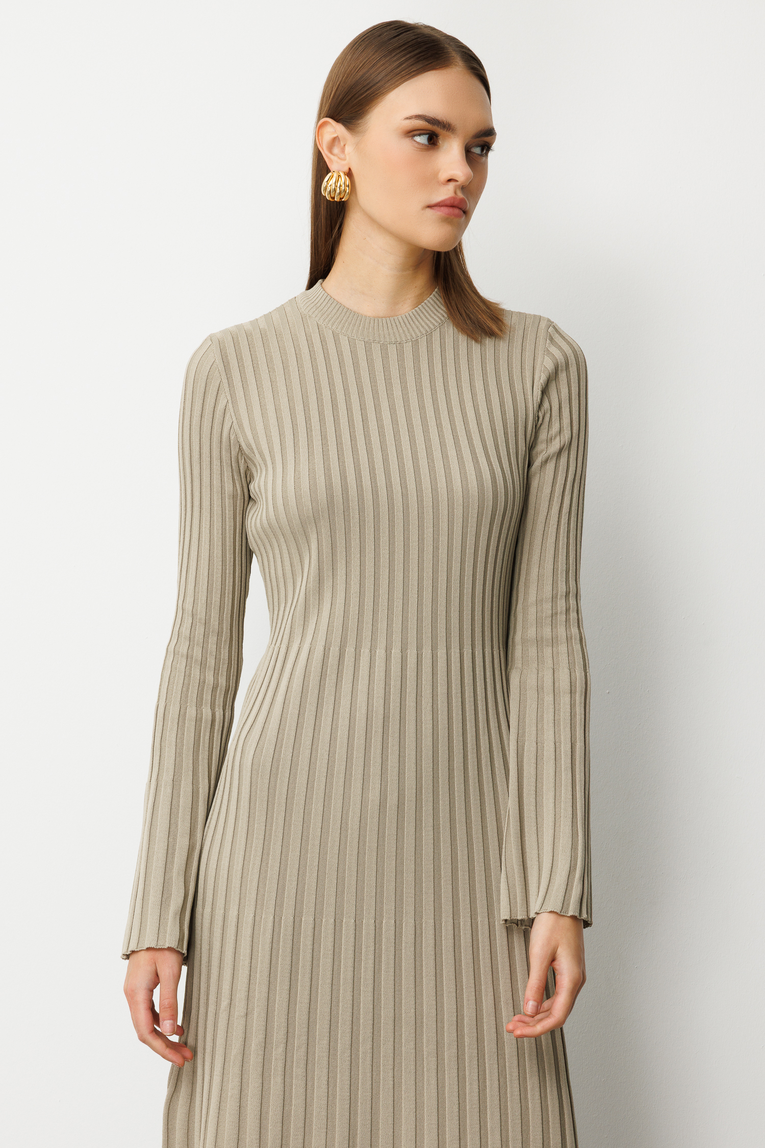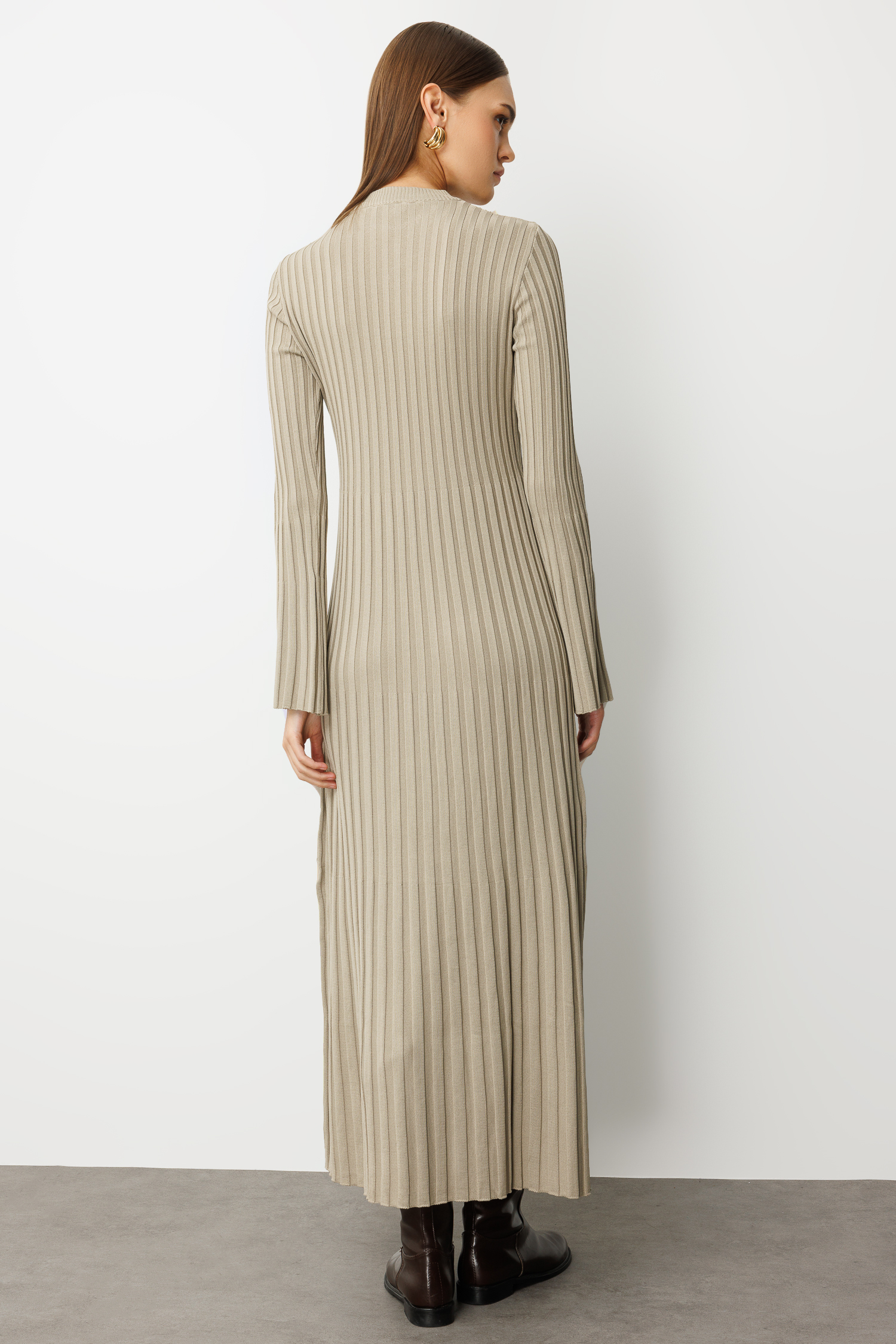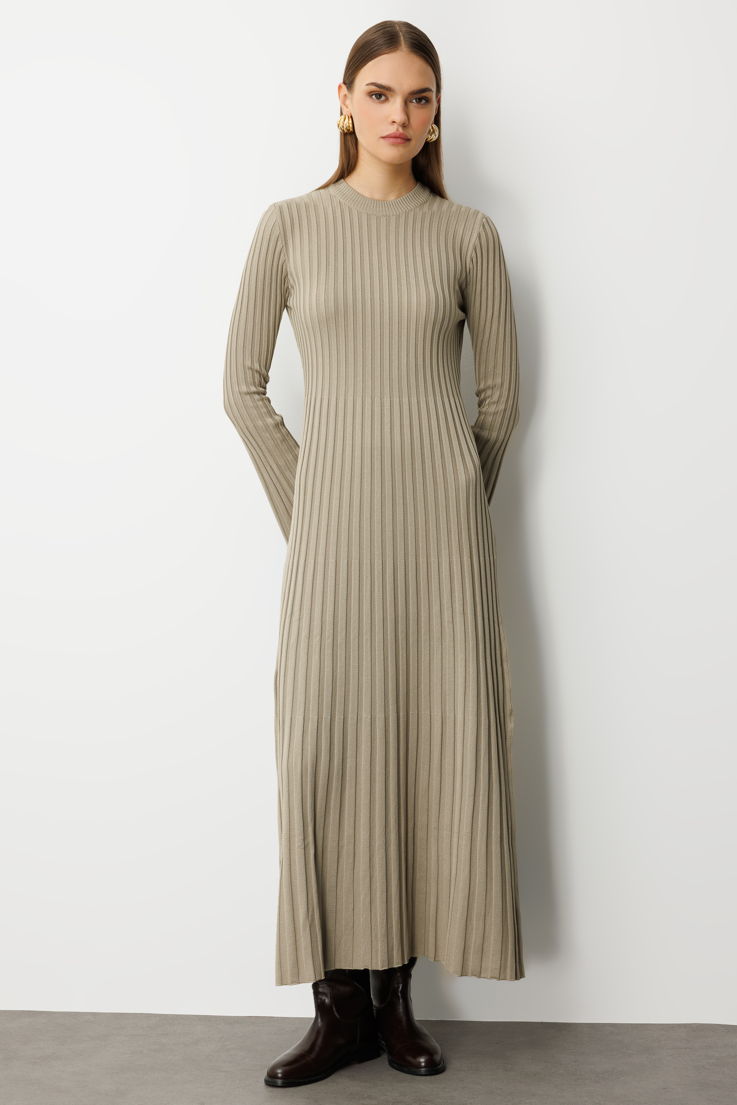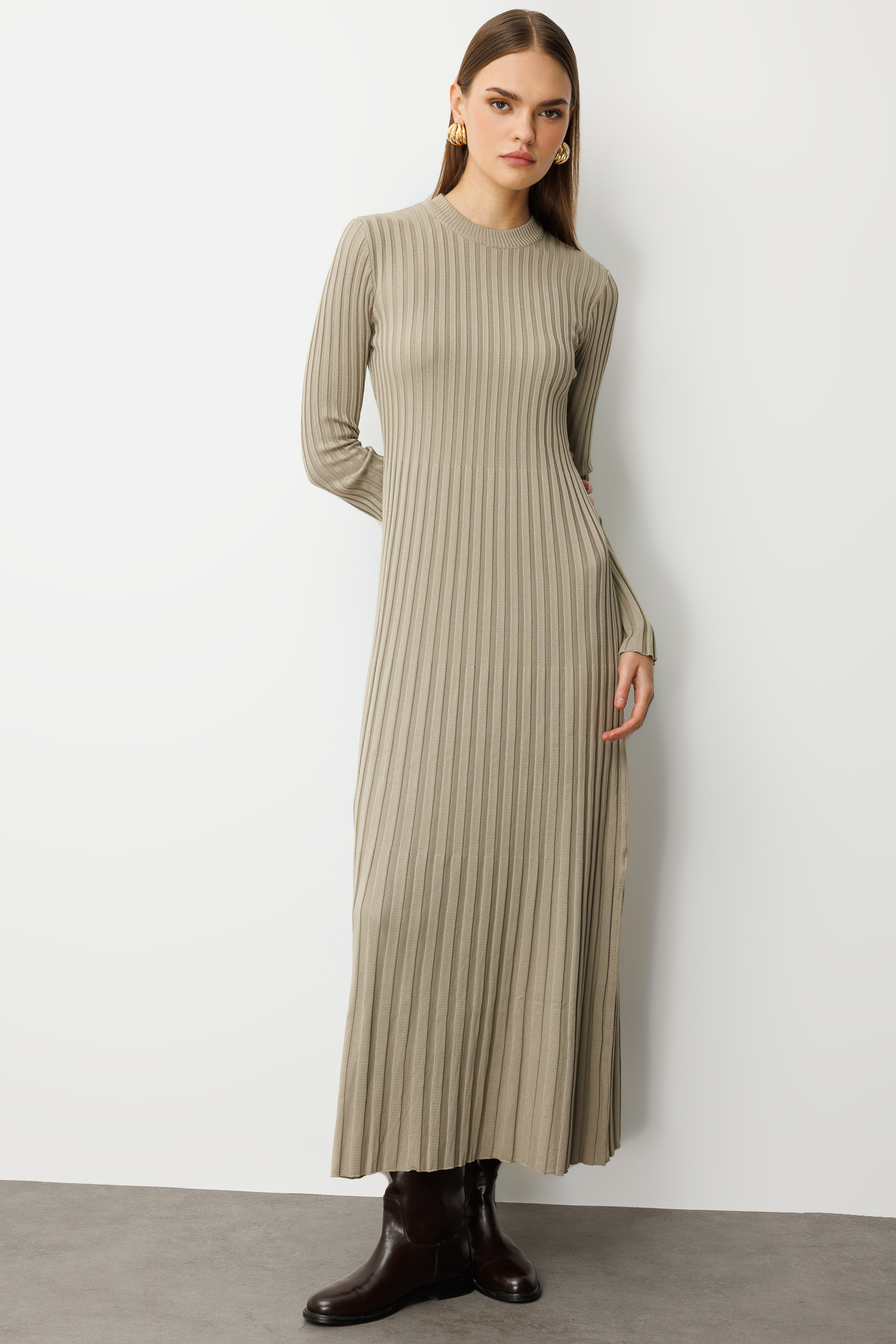 Mizalle Volanlı Etekli Yuvarlak Yaka Vizon Rengi Kaşkorse Uzun Triko Elbise
