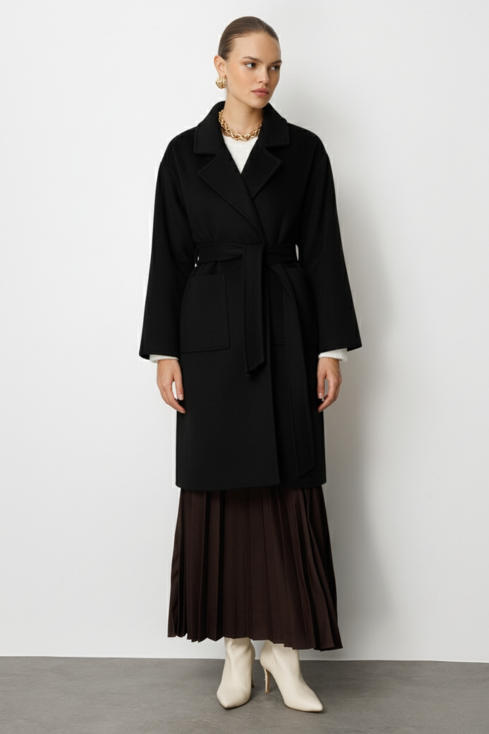 Soğuk günlerde stilinizden ödün vermeyin. Yüksek yün oranına sahip kaşe kumaşımız, maksimum sıcaklık sağlarken aynı zamanda kumaşın vücudunuzda tok ve zarif bir döküm sergilemesini garantiler.
