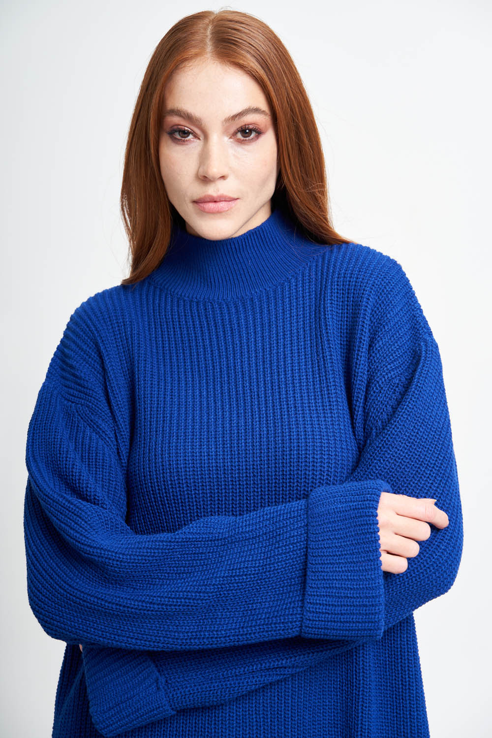 Mizalle Yüksek Yaka Oversize Saks Mavi Triko Kazak